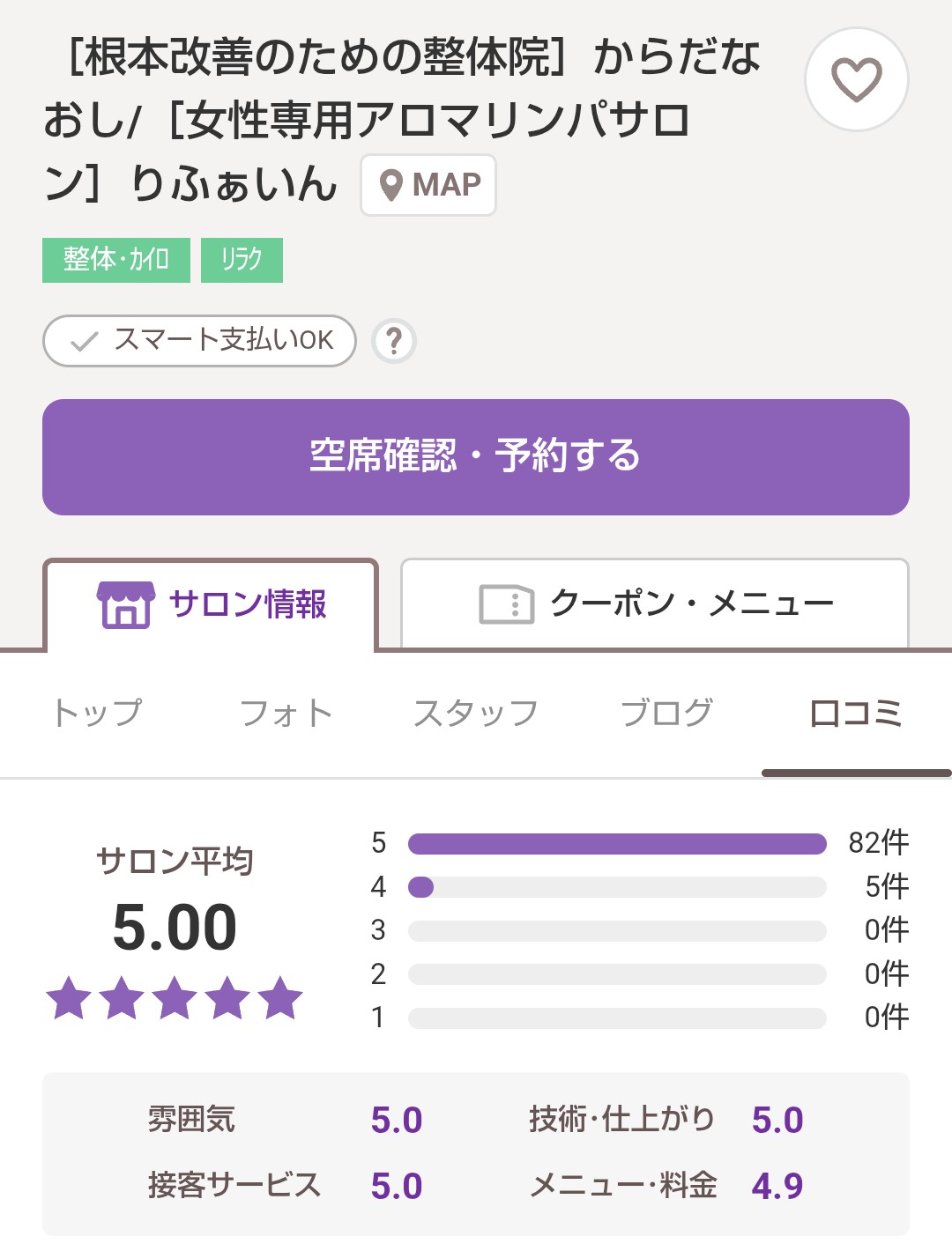 おかげさまでホットペッパービューティーの口コミ平均5.00の評価をいただきました。